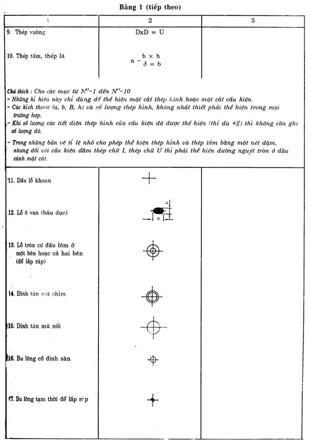 1.3. Những kí hiệu quy ước chung về loại vật liệu thép và các dạng liên kết trong kết cấu thép được trình bày trong bảng 1. Nếu sử dụng những kí hiệu không có trong bảng này thì phải chú thích trên bản vẽ