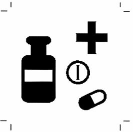 Một cái chai có nút và các viên thuốc. Dấu thập chỉ sự chăm sóc sức khỏe CHÚ THÍCH Dấu thập y tế có thể được thay thế bằng các ký hiệu khác thích hợp với văn hóa của từng quốc gia sử dụng. |