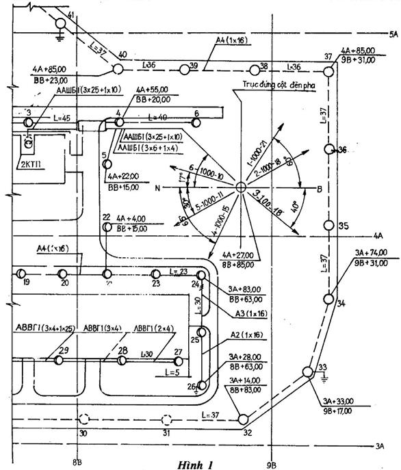 Trên bản vẽ phải thể hiện đầy đủ các kích thước định vị của các cột điện, cột đèn…so với các chuẩn trên mặt bằng khu vực xây dựng (kích thước giữa chúng và kích thước đển các công trình xây dựng…) Cách ghi kích thước phải theo TCVN 9:1985;
