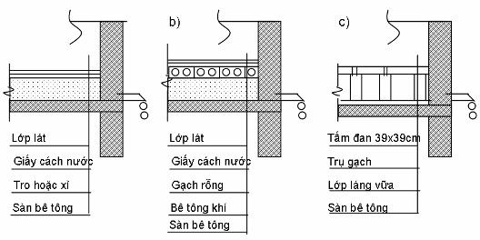 3.1.3. Láng vữa chống thấm: có thể dùng vữa xi măng cát mác 80 hoặc vữa polime láng phía trên để chống thấm láng vữa chống thấnm là việc làm bắt buộc đối với mọi loại sàn.