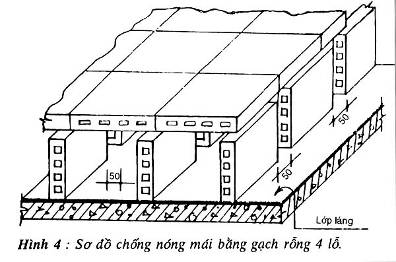 4.3. Chống nóng mái bằng gạch rỗng 4 lỗ xem sơ đồ hình 4. Các hàng gạch lát vòng quanh mái nhất thiết phải có vữa gắn xây nghiêng phía dưới. Số còn có thể có hoặc không có vữa gắn.