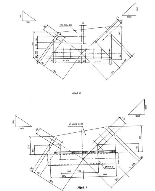 7.2. Diễn tả độ nghiêng của các đường trục của hình dạng kết cấu của các thanh bằng cách ghi lên hai cạnh ngắn của một tam giác vuông (hệ thống tam giác), dùng các giá trị ưu tiên là các khoảng cách thật của các điểm chuẩn (hoặc dùng các giá trị quy ước, là bội số của 100, ghi ở trong ngoặc) (Xem hình 8 và 9)