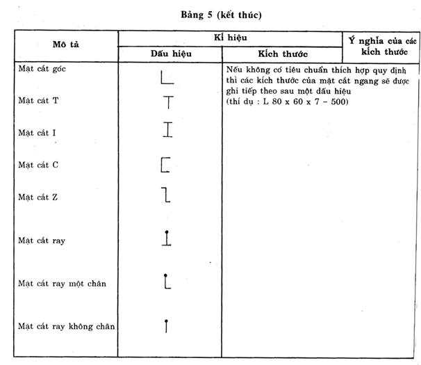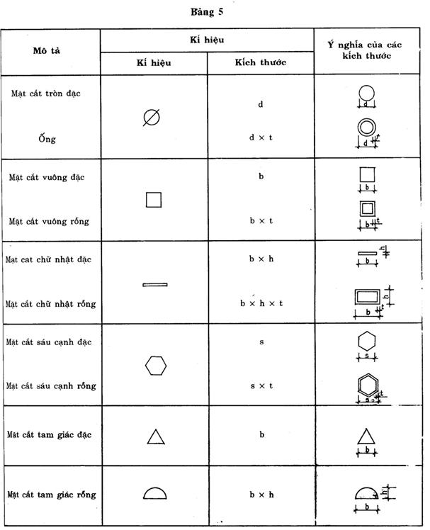 Nếu không kí hiệu theo ISO hoặc theo các tiêu chuẩn thích hợp thì áp dụng các dấu hiệu và kích thước đã chỉ dẫn trong bảng 5. Ghi ký hiệu trên bản vẽ tùy thuộc vị trí của thanh hoặc mặt cắt ngang (xem hình 5,6,7)