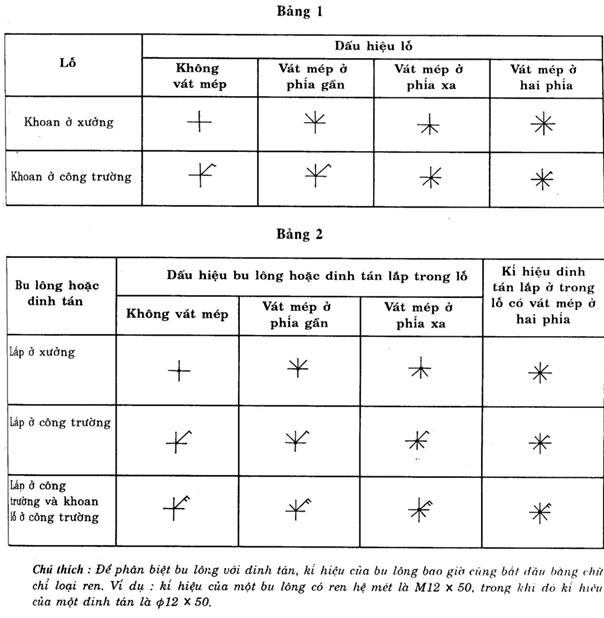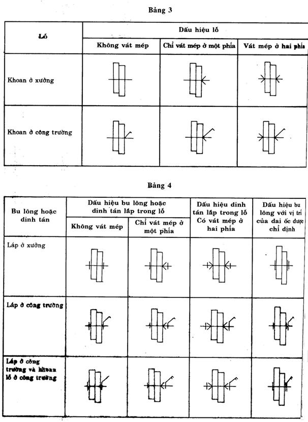 Dùng những dấu hiệu sau đây để biểu diễn các lỗ, bu lông đinh tán trên các mặt phẳng hình chiếu song song với trục của chúng (bảng 3 và 4). Chỉ riêng nét gạch nằm ngang của các dấu hiệu này được vẽ bằng nét mảnh, tất cả các phần còn lại khác vẽ bằng nét đậm.
