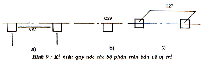 5.1. Trên bản vẽ định vị các cấu kiện chế sẵn phải được biểu thị bằng kí hiệu quy ước. Các cấu kiện giống nhau phải có kí hiệu quy ước như nhau. Các cấu kiện vận chuyển thủ công phải được chỉ rõ bằng kí hiệu độc lập. Kí hiệu quy ước của các cấu kiện trên bản vẽ định vị và bản vẽ chi tiết phải ghi ngay liền phần hình vẽ của cấu kiện (xem hình 9a và 9b hoặc với đường dóng, xem hình 9c). Các kí hiệu quy ước cho trong các hình vẽ chỉ là các ví dụ.