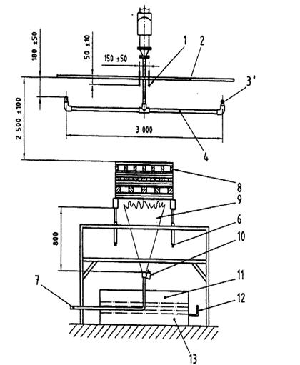 Sprinkler được lắp đặt sao cho luồng nước phun xuống dưới dội vào tấm phân tán đối diện.