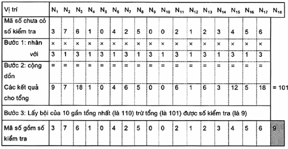 Ví dụ cách tính số kiểm tra cho trường gồm 18 ký tự
