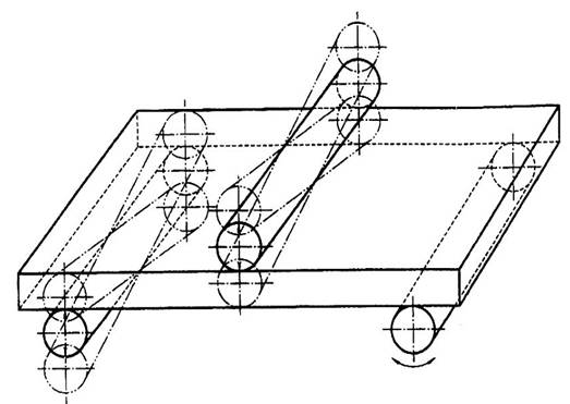7.3 Đối với gạch hai mặt như nhau, ví dụ gạch gốm trang trí không phủ men, thì mặt nào quay lên trên cũng được. Đối với gạch đùn, đặt mẫu sao cho các đường gân của viên gạch vuông góc với các trụ đỡ. Các trường hợp gạch chữ nhật khác, đặt mẫu thử sao cho cạnh dài đúng vào các trụ đỡ.