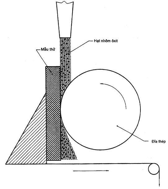 Đặt mẫu thử lên thiết bị thử (4.1) sao cho mặt mẫu thử tiếp tuyến với đĩa quay. Phải đảm bảo cấp đều vật liệu mài (4.3) vào vùng mài với lưu lượng (100 ± 10) g/100 vòng quay.