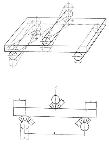 – Thực hiện: đặt tấm kiểm tra vào thiết bị, tựa lên 3 vấu đỡ cố định ở 3 vị trí của tấm kiểm tra. Tâm của 3 vấu đỡ cố định đều phải cách mép tấm kiểm tra 10 mm. Vấu tỳ 1 và 2 (để đo) cũng ở vị trí cách mép tấm kiểm tra 10 mm. Điều chỉnh 3 đồng hồ (ứng với 3 vị trí vấu tỳ 1, 2, 3) ở vị trí chuẩn (O). Lấy tấm kiểm tra ra, đưa viên gạch cần kiểm tra vào, úp mặt men xuống. Ghi giá trị thể hiện ở 3 đồng hồ. Sau đó xoay viên gạch sang cạnh khác, cứ thế ta có 4 lần ghi giá trị cho mỗi viên gạch.