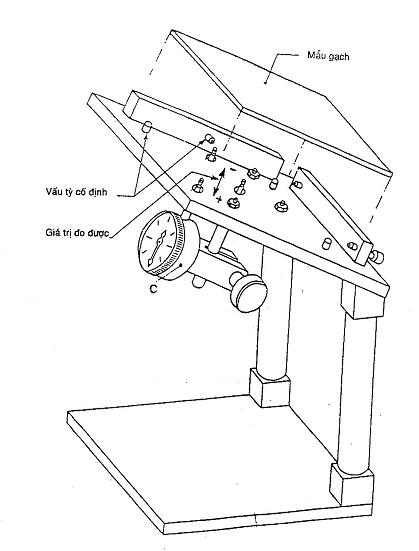 – Thực hiện: đặt viên gạch vào thiết bị hình 3, định vị vấu tỳ ngang 1, 2, 3, cách góc khoảng 5 mm, vị trí của đồng hồ (B) cũng cách góc 5 mm. Lấy viên gạch ra, đặt tấm kiểm tra vào để điều chỉnh đồng hồ (B) ở vị trí chuẩn (C). Lấy tấm kiểm tra ra và đặt viên gạch cần kiểm tra vào, úp mặt men xuống, tỳ lên các vấu đỡ. Đọc kết quả chỉ thị trên đồng hồ (B) chính xác đến 0,1 mm. Sau đó xoay viên gạch sang cạnh khác. Nếu là gạch vuông, sẽ có 4 lần đo như thế. Nếu là gạch chữ nhật thì cũng đo như trên nhưng chú ý vị trí của đồng hồ (B) luôn cách góc 5 mm đối với chiều dài hoặc chiều rộng của viên gạch.