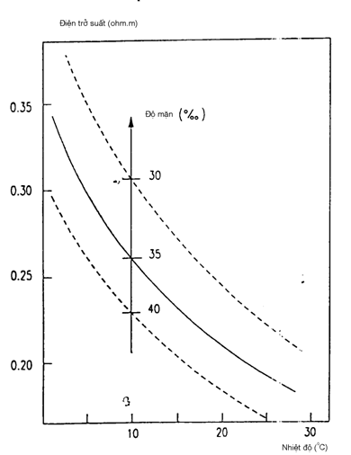 A2.7.1. Điện trở suất r (ohm.m) của nước biển là một hàm của độ mặn và nhiệt độ. Trong vùng biển mở độ mặn không thay đổi lớn và nhiệt độ là yếu tố chính. Hình A2.7-1 đưa ra mối quan hệ giữa điện trở suất và nhiệt độ tại độ mặn từ 30 đến 40‰ (phần nghìn – parts per thousand).