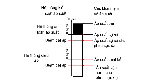 3.3.2. Hệ thống điều áp phải có khả năng giữ áp suất vận hành nằm trong khoảng giới hạn cho phép trong điều kiện vận hành bình thường. áp suất cài đặt của hệ thống điều áp phải được đặt sao cho áp suất thiết kế cục bộ không bị vượt quá tại một điểm bất kỳ trên hệ thống đường ống. Một lượng bù phải được đưa vào làm dung sai cho điểm đặt của hệ thống điều áp và các thiết bị đo đạc kèm theo, xem hình 3.3-1. Các thuật ngữ, giảI thích về kháI niệm áp suất được quy định tại TCVN 6475-1: 2007 mục 6.1.