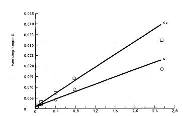 Hình B.8 – Hàm lượng mangan trong quặng sắt: Độ lệch chuẩn lặp lại và tái lập là một hàm tuyến tính của mức nồng độ m