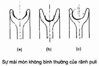Bất kì dấu hiệu khác thường nào như vết lằn của cáp trên rãnh puli đều phải loại bỏ (dưới đây cho 03 trường hợp mòn không bình thường của rãnh puli)