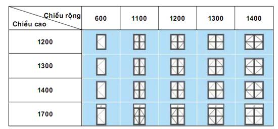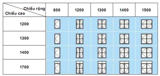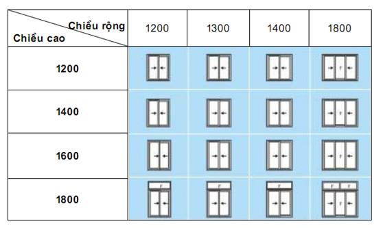 A.4. Một số kích thước thông dụng của cửa sổ mở trượt được thể hiện trên Hình A.4