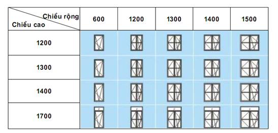 Hình A.1 – Kích thước thông dụng của cửa sổ mở quay lật vào trong