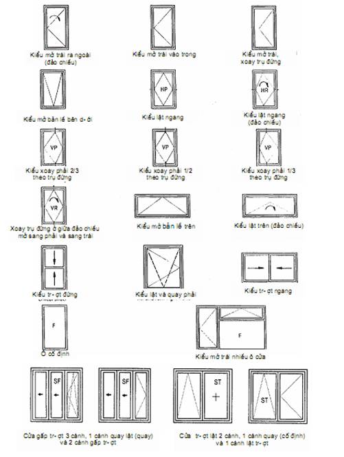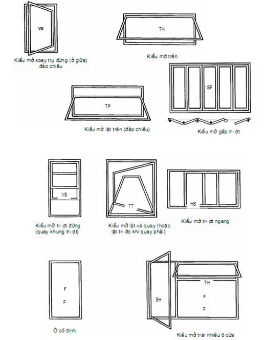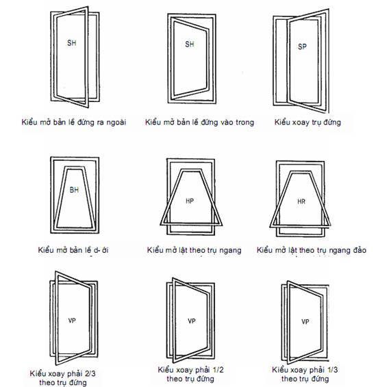 Cửa được thiết kế theo nhiều kiểu mở. Ký hiệu qui ước cho từng kiểu như sau (mô tả trên Hình 1):