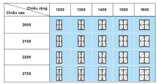A.6. Một số kích thước thông dụng của cửa đi hai cánh mở quay được thể hiện trên hình A.6.