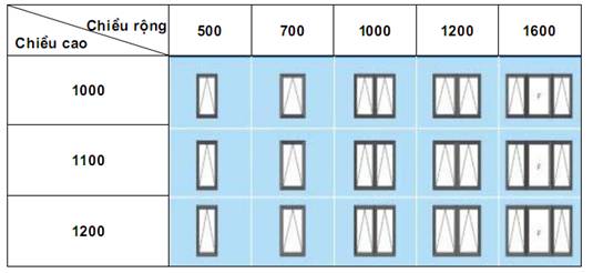 A.5. Một số kích thước thông dụng của cửa sổ mở hất ra ngoài được thể hiện trên Hình A.5.