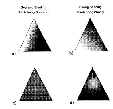 Tô sáng từ trên xuống trong hình tam giác: c) Hiệu ứng tô bóng Gouraud; d) Hiệu ứng tô bóng Phong.