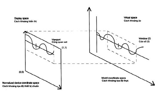 Ánh xạ của cửa sổ (tọa độ lớn) sang cổng nhìn (tọa độ thiết bị chuẩn hóa) bao gồm việc xén