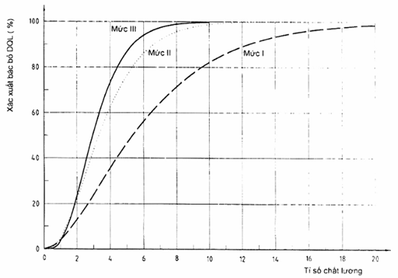 VÍ DỤ: Giả sử sử dụng phương án ứng với mức chất lượng công bố là 0,25 % cá thể không phù hợp. Đối với tỉ số chất lượng là 4 (mức chất lượng thực tế bằng 4 lần mức chất lượng công bố, nghĩa là 1,0 % cá thể không phù hợp) thì có xác suất 73,6 % là phương án lấy mẫu này sẽ chỉ ra việc bác bỏ mức chất lượng công bố.