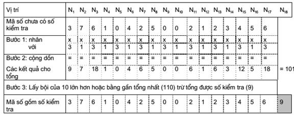 VÍ DỤ: Cách tính số kiểm tra cho trường gồm 18 ký tự: