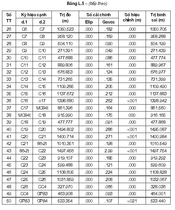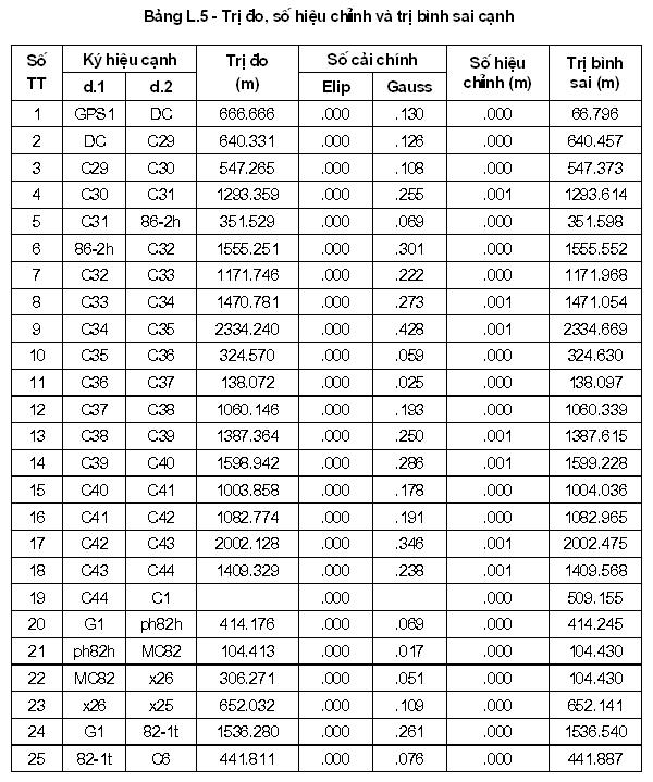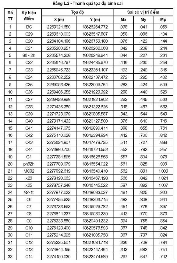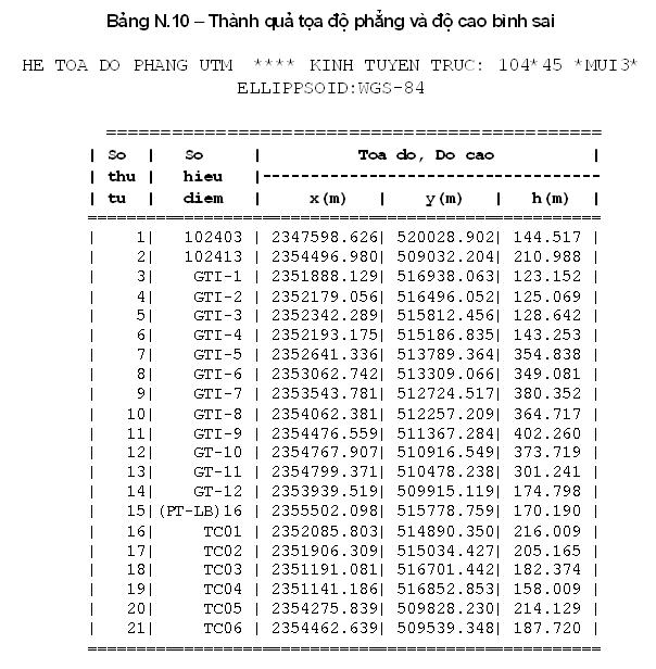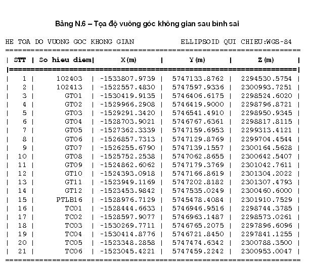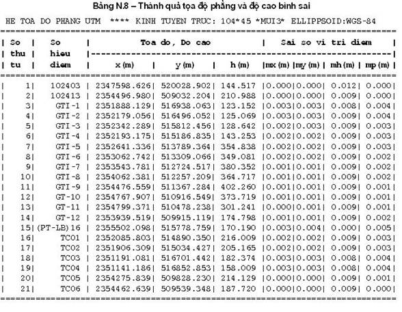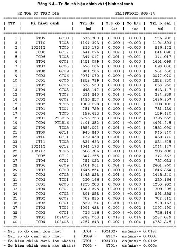 Ví dụ: Thành quả tính toán bình sai lưới mặt bằng Đường chuyền cấp 1
