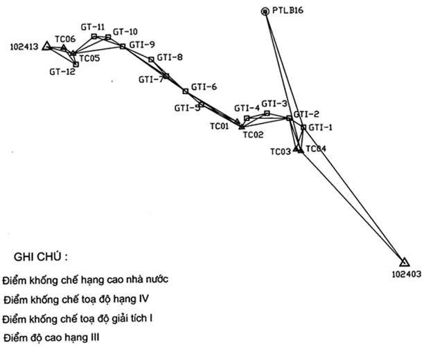 Lưới khống chế cơ sở hạng 4 lấy điểm khống chế Nhà nước hạng 3 làm điểm gốc, lưới cấp 1 (giải tích 1, đường chuyền cấp 1) lấy điểm cơ sở hạng 4 làm gốc, lưới cấp 2 (giải tích 2, đường chuyền cấp 2) lấy điểm cấp 1 làm gốc.