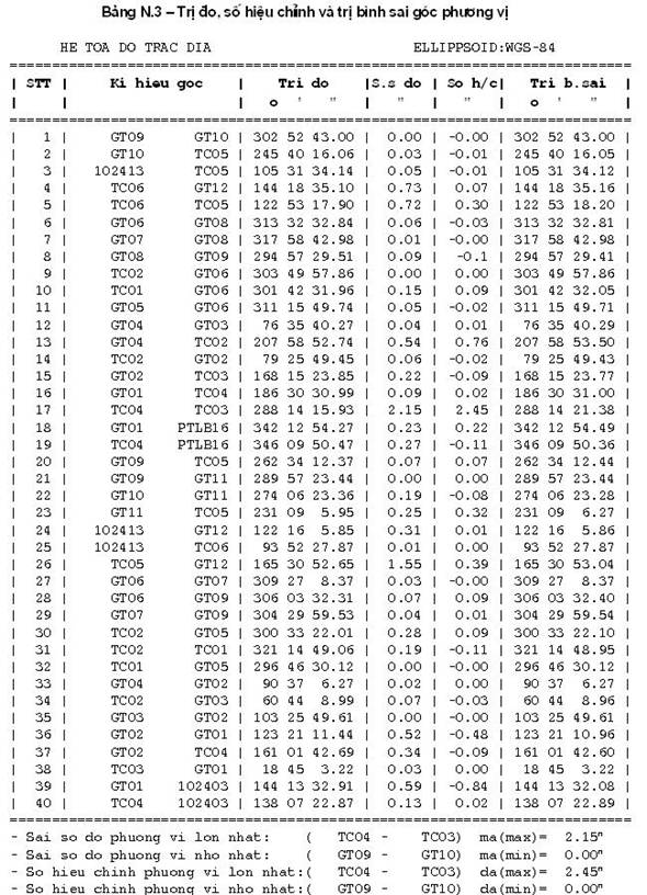 Kết quả là qua máy toàn đạc điện tử xác định được các trị góc ngang, đứng với độ chính xác đến 1” – 3”, khoảng cách đến mm, cao tọa độ xác định đến mm. Trị số khoảng cách chênh nhau giữa 3 lần đo đi, đo về đạt: