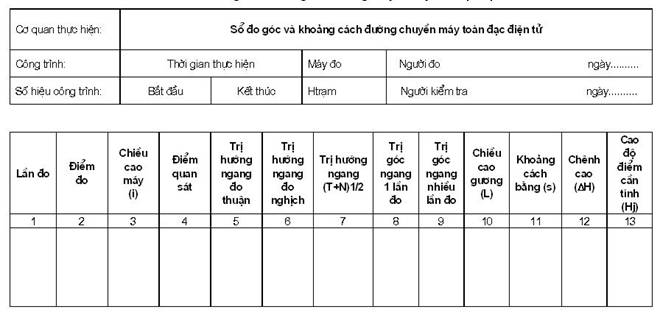 MẪU SỔ ĐO GÓC VÀ KHOẢNG CÁCH ĐƯỜNG CHUYỂN MÁY TOÀN ĐỌC ĐIỆN TỬ
