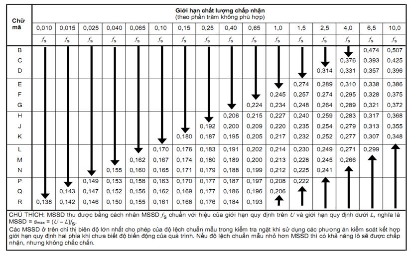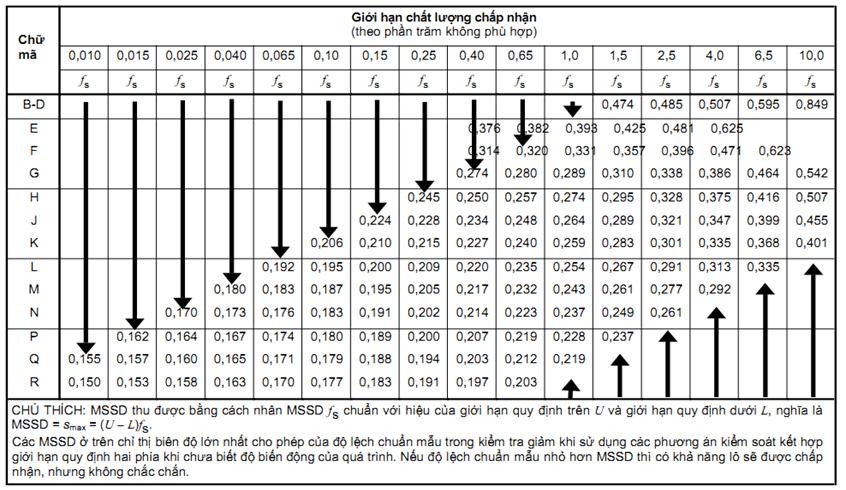 Coi việc tính toán xác suất chấp nhận ở chất lượng của quá trình là 2,5 % không phù hợp đối với phương án theo phương pháp “σ” với AQL 1,0 % và chữ mã cỡ mẫu M trong kiểm tra thường.