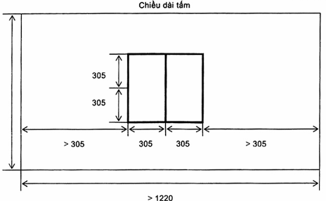 Cắt 2 mẫu có kích thước (305 x 610) mm từ cùng một tấm mẫu sao cho chiều cạnh 305 mm song song với gờ tấm. Cắt các mẫu thử cách cạnh và gờ ít nhất 305mm với các tấm mẫu có chiều rộng bằng 1 220 mm hoặc lớn hơn. Cắt mẫu ở trung tâm tấm nếu tấm mẫu có chiều rộng hẹp hơn 1 220 mm như ở Hình 1.