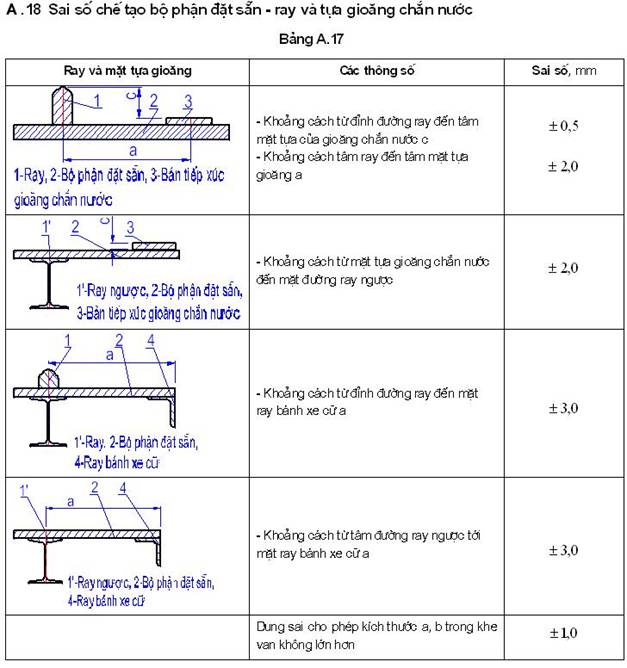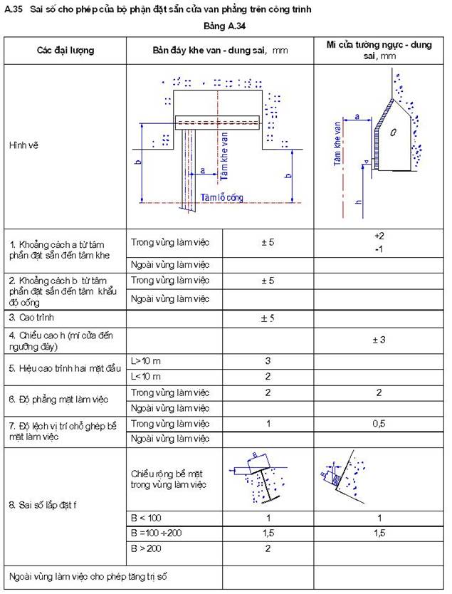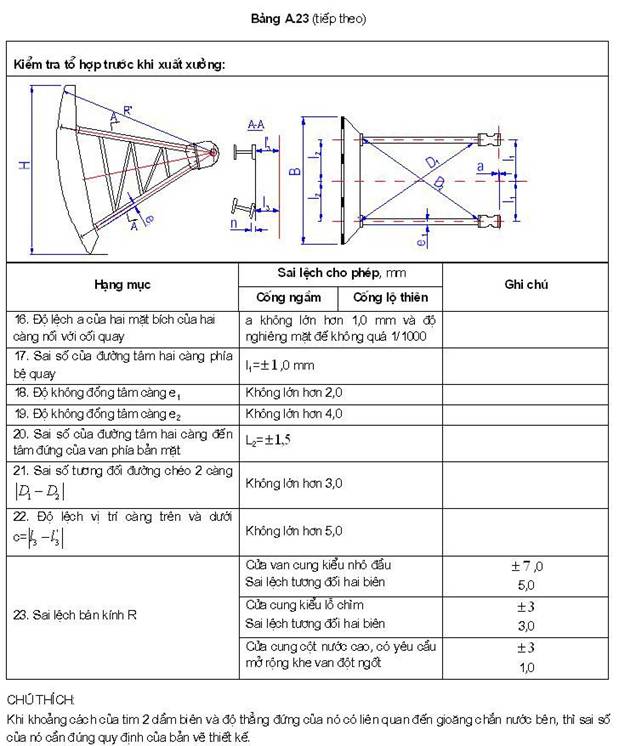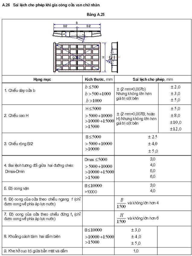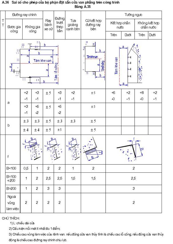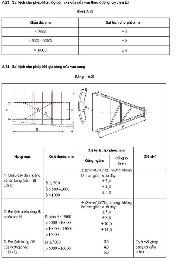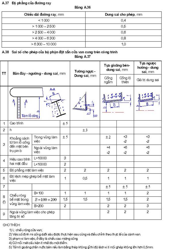 5.4.3 Dung sai chế tạo bánh xe, bạc, trục của cửa van phải phù hợp yêu cầu thiết kế. Nếu không quy định thì chọn trong khoảng IT6 ¸ IT8, độ nhẵn bề mặt Ra < 3,2 mm, độ chính xác hình dạng và vị trí không thấp hơn cấp 9. Sau khi lắp hoàn chỉnh, bánh xe phải quay nhẹ nhàng, không kẹt.