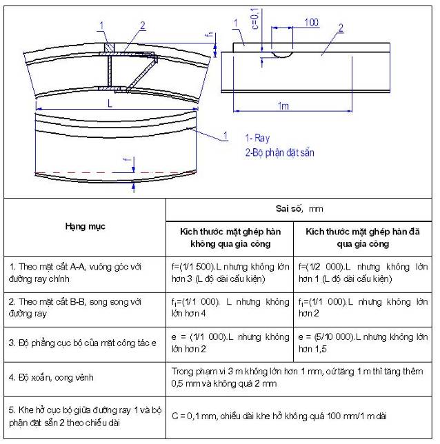 1) Trên bề mặt gia công chịu nén có vết rỗ không lớn hơn 3 cm2, độ sâu không lớn hơn 1/10 độ dày thành nơi bị khuyết tật, đồng thời trên bề mặt nằm ngang hoặc trên diện tích 100 cm2 không quá 1 điểm khuyết tật, tổng diện tích khuyết tật không lớn hơn 2 % tổng diện tích mặt gia công. Nhưng không cho phép hàn đắp đối với đường ray phải qua nhiệt luyện và vị trí khuyết tật nằm trong phạm vi tiếp xúc của bánh xe;