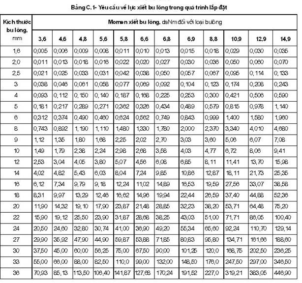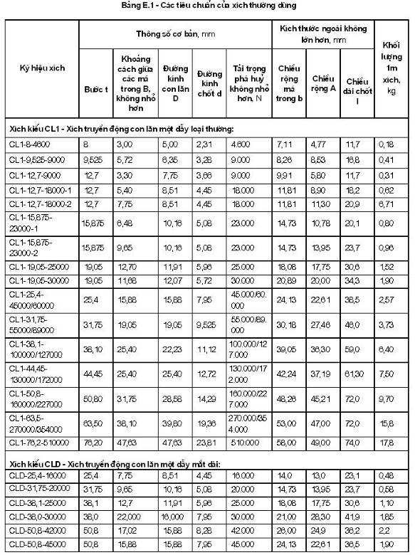 Bảng E.1 – Các tiêu chuẩn của xích thường dung (tiếp theo)