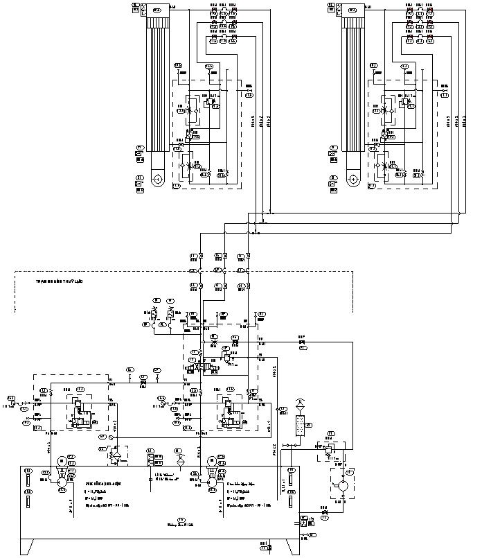 b) Các bản vẽ thể hiện sơ đồ đấu nối các đường ống thủy lực, sơ đồ đấu nối cáp điện động lực và cáp điện điều khiển. Tất cả các cụm chi tiết lớn như xi lanh thủy lực, trạm nguồn thủy lực và tủ điện đều có bản vẽ mô tả kích thước lắp ráp, thông số cân nặng phục vụ cho việc vận chuyển và lắp đặt tại công trường;