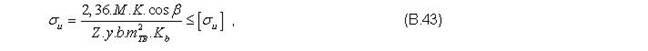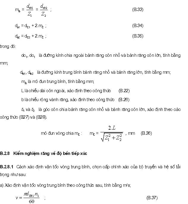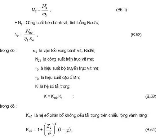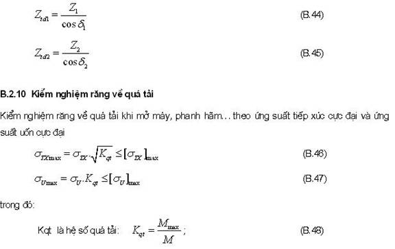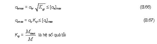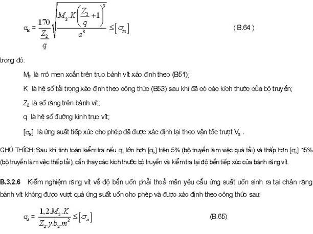 B.3.2.7 Kiểm nghiệm răng bánh vít về quá tải khi mở máy, phanh hãm theo ứng suất tiếp xúc cực đại và ứng suất uốn cực đại, áp dụng công thức sau: