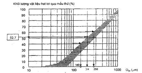 Bước 7: Xác định kích thước lỗ lọc O90 của vải địa kỹ thuật trên đường cong giữa thành phần vật liệu hạt lọt qua mẫu thử tính bằng % và kích thước sàng tính bằng  (Hình 3)
