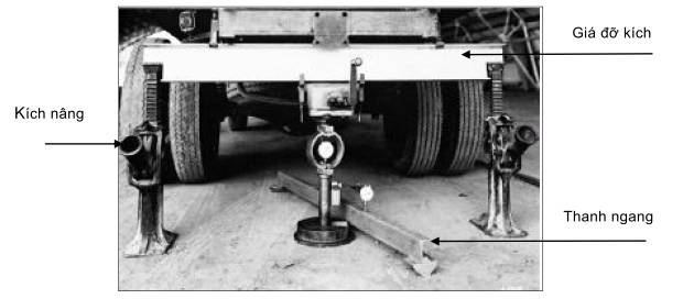 4.2.4 Khi sử dụng khối chất tải là xe tải, xe phải được chất đủ tải. Giá đỡ kích gia tải dạng dầm thép được thiết kế và gá lắp phù hợp ở phía sau xe. Cần có 2 kích nâng chịu được tải trọng lớn hơn 15 tấn để nâng phần đuôi thân xe, nhằm đảm bảo tải trọng xe không còn tác dụng vào nhíp xe gây ảnh hưởng đến kết quả thử nghiệm . Thanh ngang (có gắn đồng hồ đo độ xuyên được đỡ bằng trụ đỡ) được đặt vuông góc với trục xe để tránh ản h hưởng của tải trọng 2 kích và bánh xe khi đo (Hình 3).