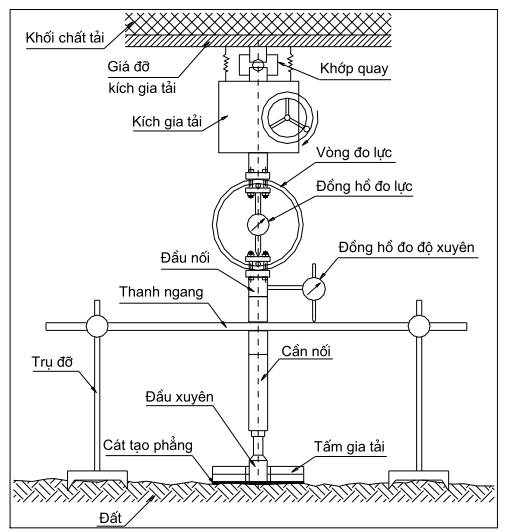 4.1.1 Kích gia tải: tạo lực nén cho đầu xuyên, có khả năng tạo lực nén phù hợp, không nhỏ hơn 45 kN. Hành trình của kích không nhỏ hơn 50 mm. Kích phải có khớp nối chuyên dụng nối với giá đỡ kích để đầu xuyên dễ dàng di chuyển theo chiều thẳng đứng khi thí nghiệm.