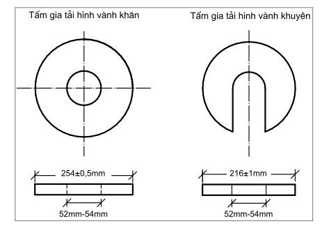 4.1.8.1 Tấm gia tải hình vành khăn: 01 tấm tròn kim loại, khối lượng 4,54 kg ± 0,01 kg, đường kính ngoài 254 mm 0,5 mm, đường kính lỗ từ 52 mm đến 54 mm (Hình 1).