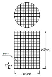 4.2 Rọ đựng mẫu: hình trụ, chiều cao 165 mm, đường kính 108 mm. Rọ được chế tạo bằng lưới kim loại, lỗ vuông, kích cỡ 6,3 mm ( như kích cỡ sàng lỗ vuông 6,3 mm). Đáy rọ được thiết kế cao hơn đáy thành bên 25 mm (Hình 1).