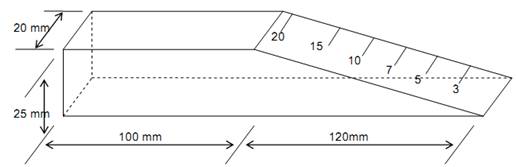 3.2. Con nêm: thường được chế tạo bằng kim loại không rỉ và ít bị mài mòn, hình tam giác có khắc dấu 6 giá trị chiều cao: 3 mm, 5 mm, 7 mm, 10 mm, 15 mm và 20 mm để nhanh chóng đọc được trị số khe hở (mm) giữa mặt đường và cạnh dưới của thước thẳng 3 mét (Hình 2).