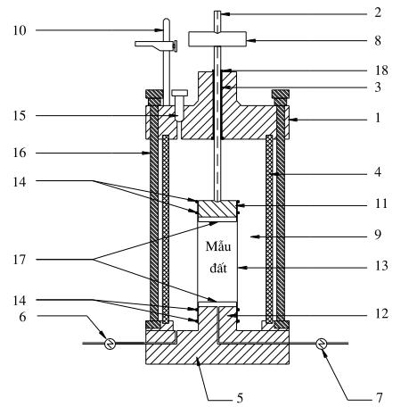 11 Tấm nén trên 12 Tấm đế dưới 13 Màng (cao su…) 14 Gioăng cao su 15 Nút xả khí 16 Thanh giằng liên kết 17 Đá thấm 18 Gioăng cao su (giữa nắp buồng và pittông) 19 Van áp lực nước lỗ rỗng 20 Thiết bị đo áp lực nước lỗ rỗng 21 Van áp lực ngược |