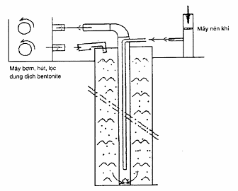 Sau khi đặt cốt thép, chiều sâu hố khoan được kiểm tra và làm sạch. Việc làm sạch đáy hố khoan có ý nghĩa quyết định đến sức chịu tải của cọc. Mùn khoan lắng đọng, đất từ thành hố khoan sụt lở phải được thổi rửa bằng công nghệ thích hợp. Việc thổi rửa có thể được thực hiện bằng ống đổ bêtông kết hợp với ống dẫn khí nén đường kính 45mm. Áp lực khí nén được giữ thường xuyên là 1,5 lần áp lực cột dung dịch tại đáy hố khoan và lưu lượng khí không ít hơn 15m3/phút. Sơ đồ bố trí công nghệ thổi rửa đáy hố khoan được thể hiện trên hình 2. Bentonit và mùn khoan Ở đáy hố khoan được áp lực khí nén đẩy ra ngoài thông qua hệ thống ống đổ bêtông. Cần bổ sung bentonit mới vào hố khoan khi dung dịch bentônit tụt khoảng 1,5m so với cao độ đỉnh ống chống.