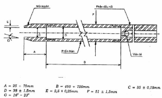 2.3. Đầu xuyên là một ống thép có tổng chiều dài đến 810 mm, gồm ba phần: phần mũi, phần thân, phần đầu nối và được nối với nhau bằng ren. Quy cách cụ thể:
