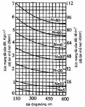 Hình E-1 cho đồ thị dự báo sức mang tải của móngnôngtrên đất rời với các bề rộng móng khác nhau và giới hạn độ lún không vượt quá 25 và 40 mm (Peck; Hanson…).