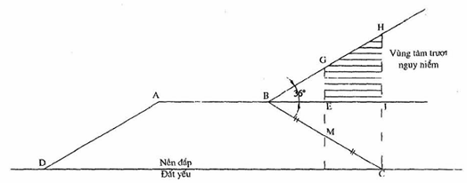 Nếu nền đắp bằng cát (lực dính C = 0) thì giao điểm giữa mặt trượt nguy hiểm với bề rộng nền đường có thể đổi trên cả phạm vi AB, còn nếu đắp bằng đất dính thì giao điểm này thường ở lân cận điểm A.